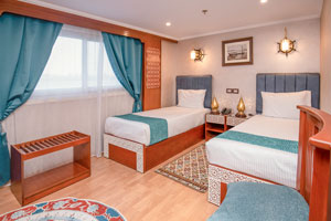 Parmi les 12 cabines du Queen Isis II, découvrez la vôtre… Profitez de l’intimité que vous livre cette luxueuse chambre équipée de deux larges fenêtres, savamment décorée de tons doux et pourvue de tout le confort moderne : deux lits jumeaux douillets, la climatisation et une salle d’eau privée et équipée. Tandis que les 23 autres passagers du vaisseau profitent du salon-bar, prélassez-vous dans le jacuzzi du solarium et admirez les rives verdoyantes du Nil… Alors qu’un temple se dégage du paysage environnant, attablez-vous au restaurant du bateau. Les buffets de cuisine traditionnelle qui y sont préparés vous emmènent pour un voyage au pays des saveurs !