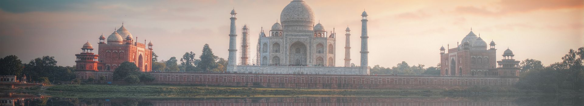 Inde - Vue sur le mausolée de Taj Mahal et effet miroir sur la rivière Yamuna, à Agra